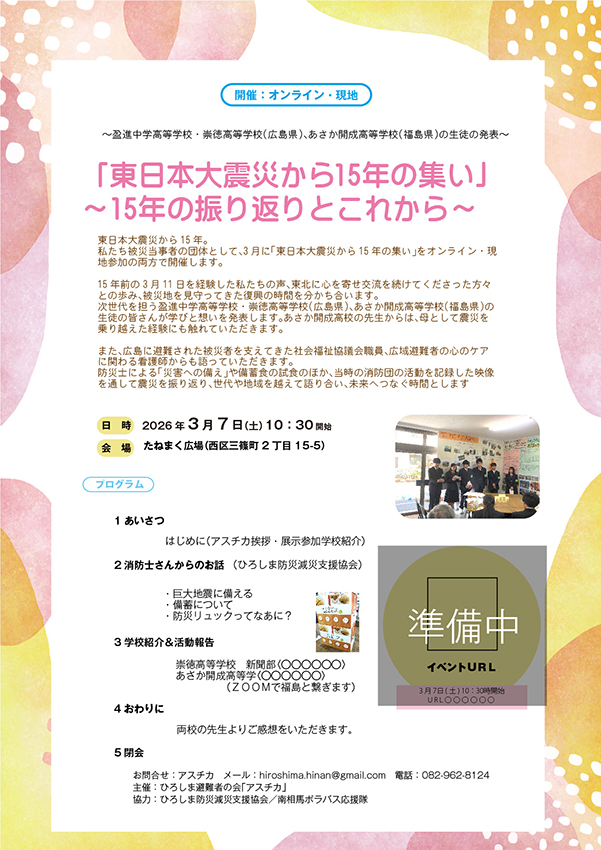 ~盈進中学高等学校・崇徳高等学校(広島県)、あさか開成高等学校(福島県)の生徒の発表~ 「東日本大震災から15年の集い」 日時:2026年3月7日(土)10:30開始 場所:たねまく広場(西区三篠町2丁目15-5) ▼イベント詳細チラシはこちら▼ コメントを投稿する